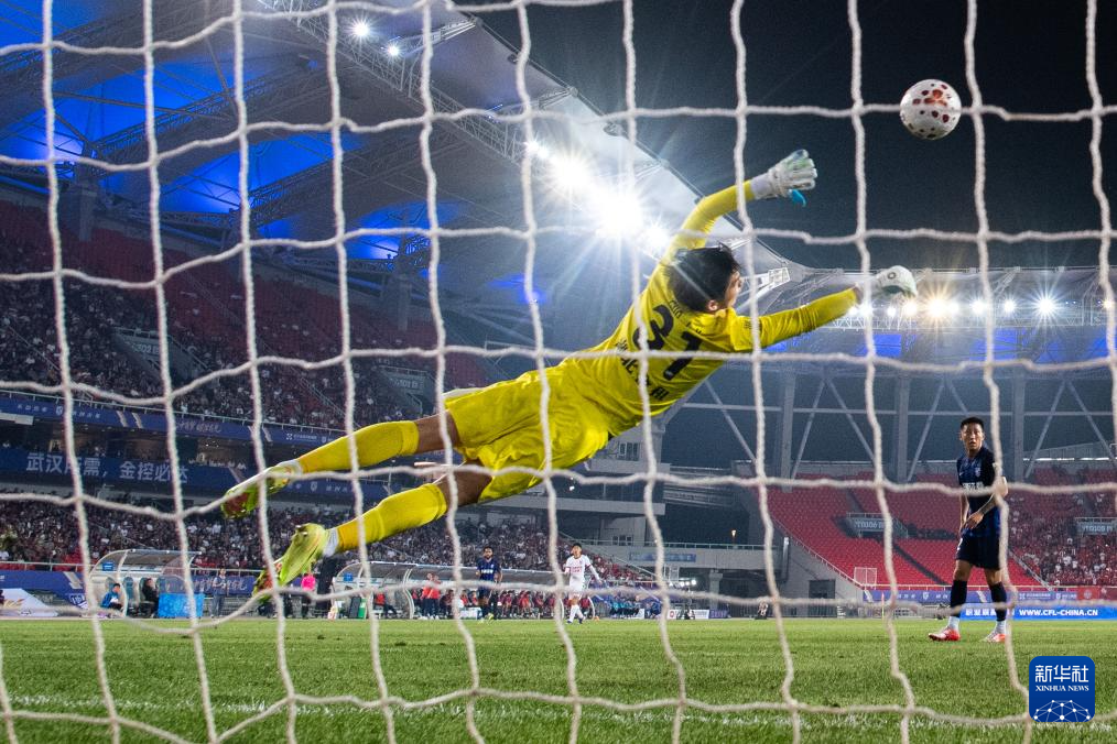 4月17日,武汉三镇队守门员郭嘉宇(左三)在比赛中扑救失利。新华社记者 肖艺九 摄