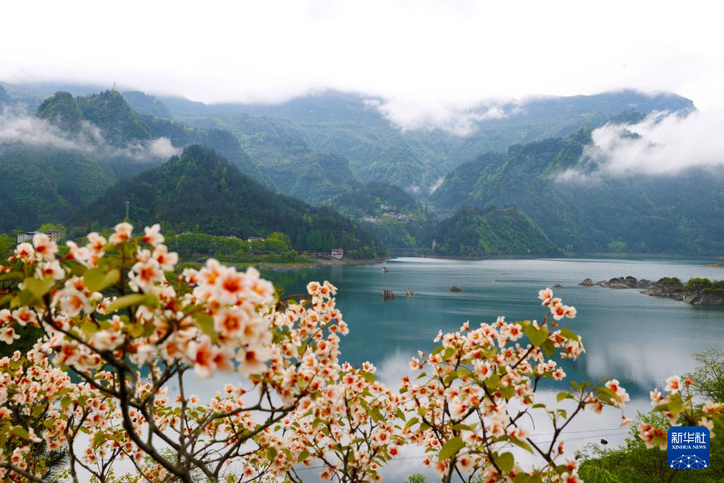 4月15日,油桐花掩映着重庆市黔江区小南海景区堰塞湖一角。新华社发(杨敏摄)