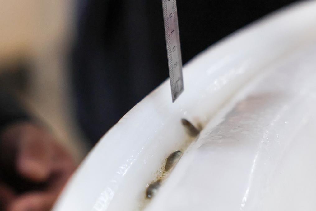 15日、延辺サクラマス水産良種場の繁殖場で行われた稚魚の検査と計数。(琿春=新華社記者/顔麟蘊)