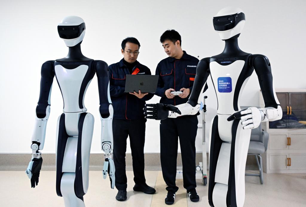 9日、青島高齢者介護ロボットトレーニングセンターで、ロボットを訓練するトレーナー。(青島=新華社記者/李紫恒)