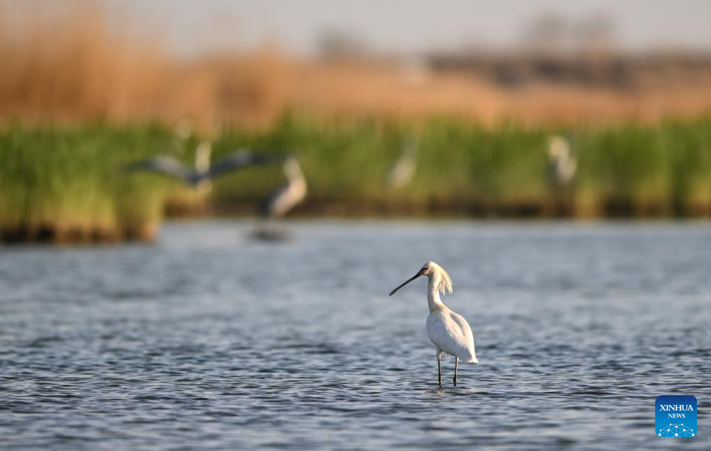 An Eurasian spoonbill forges in Shahu Lake in Pingluo County of Shizuishan City in northwest China's Ningxia Hui Autonomous Region, April 17, 2026. From March to October each year, the Shahu scenic area serves as an important breeding habitat for migratory birds, featuring vast expanses of water, abundant plankton, fish and shrimp, and a variety of ecosystems.