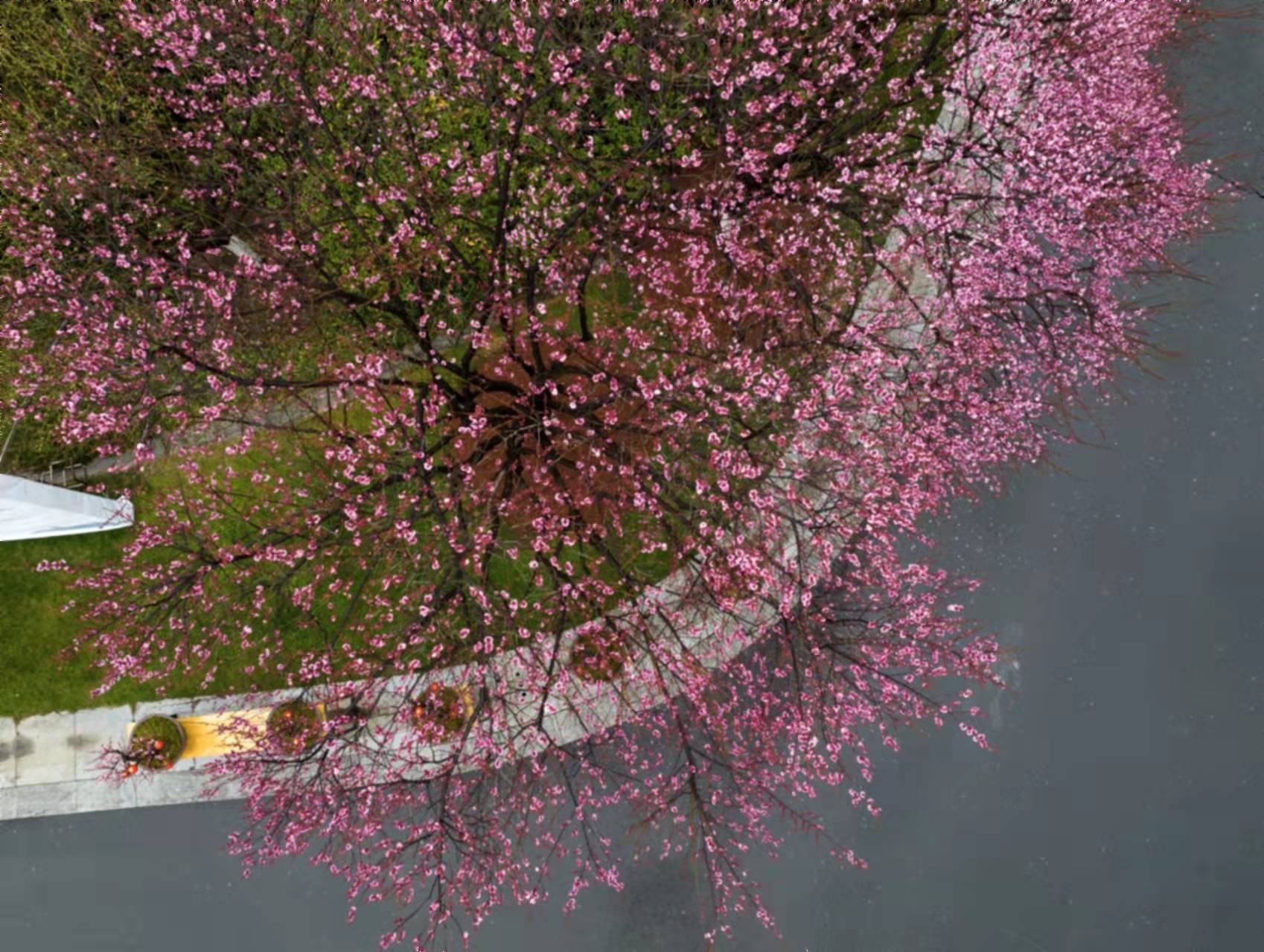 红花依碧水,仙湖早争春。在北方正冰天雪地的时候,云南澄江抚仙湖畔却红翠相染,山花烂漫,依旧温暖如春。冬樱花与绿树、蓝天、碧水,共同构成一幅色彩斑斓的山水画卷。
