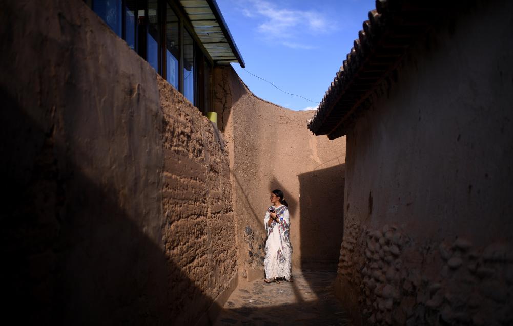 一名游客在同仁市郭麻日村郭麻日古堡内游玩。新华社记者 张宏祥 摄