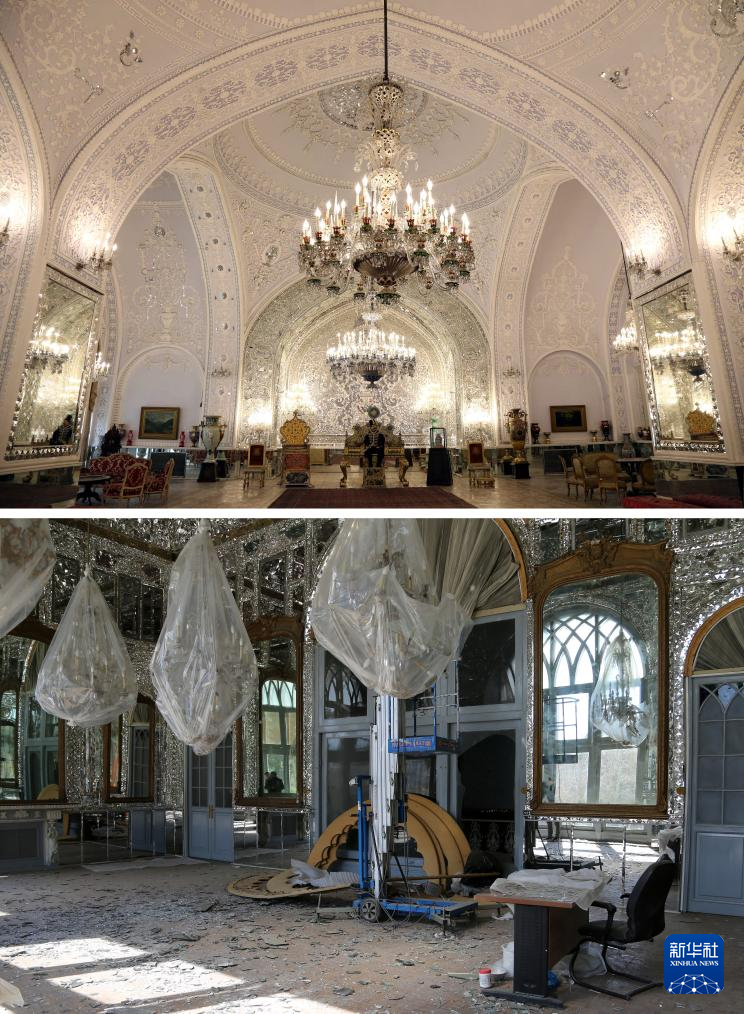 拼版照片:上图为2023年8月27日在伊朗首都德黑兰拍摄的古莱斯坦宫(新华社记者沙达提摄),下图为2026年3月3日在德黑兰拍摄的在空袭中受损的古莱斯坦宫(新华社发)。古莱斯坦宫又称“玫瑰宫”,是伊朗重要的王宫建筑群之一,2013年被联合国教科文组织列入世界遗产名录。自今年2月28日美以伊冲突爆发以来,古莱斯坦宫遭到直接打击并受到严重结构性破坏。