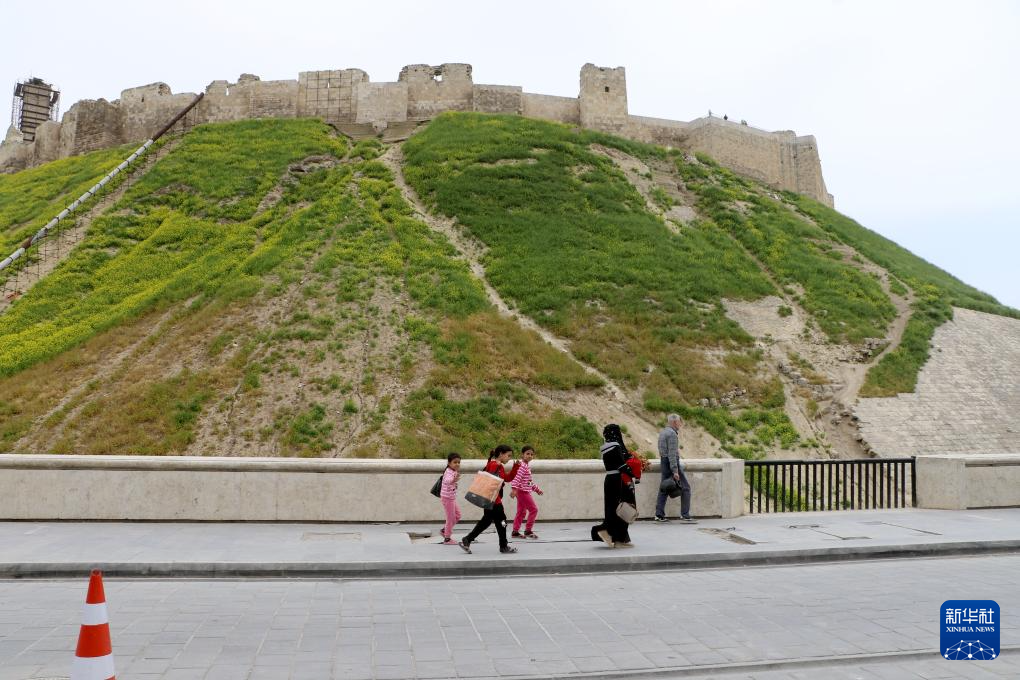 2026年4月16日,人们走过叙利亚阿勒颇城堡。作为阿勒颇古城的一部分,它于1986年被联合国教科文组织列入世界遗产名录。阿勒颇古城位于叙利亚西北部阿勒颇盆地,建城历史可追溯至公元前2000年。古城在近年的战争与地震中遭受严重破坏,城堡墙体、西塔及多处历史建筑受损。2013年,阿勒颇古城被联合国教科文组织列入濒危世界遗产名录。