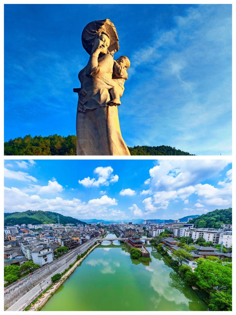上图为客家母亲雕像,下图为2024年8月30日拍摄的汀江。朱芳彬 摄