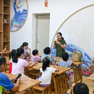 2025年10月12日,在海南省文化馆,东山草编技艺传承人袁洁(后中)为家长和小朋友们讲解东山草编技艺。新华社记者 杨冠宇 摄