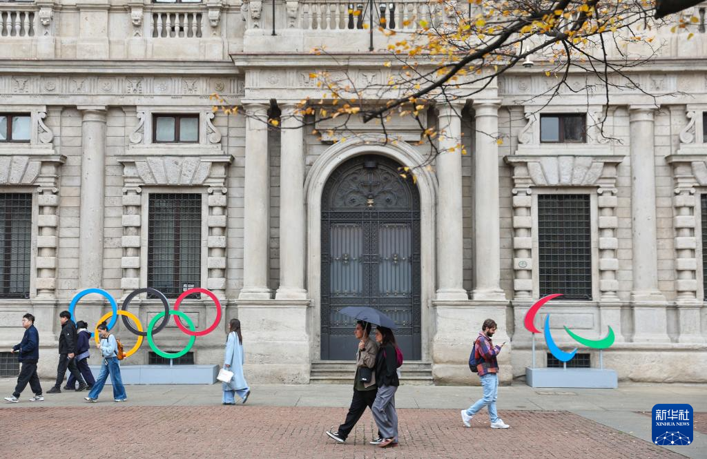 10月29日,在意大利米兰,人们经过米兰市政厅前的奥运会、残奥会会徽。