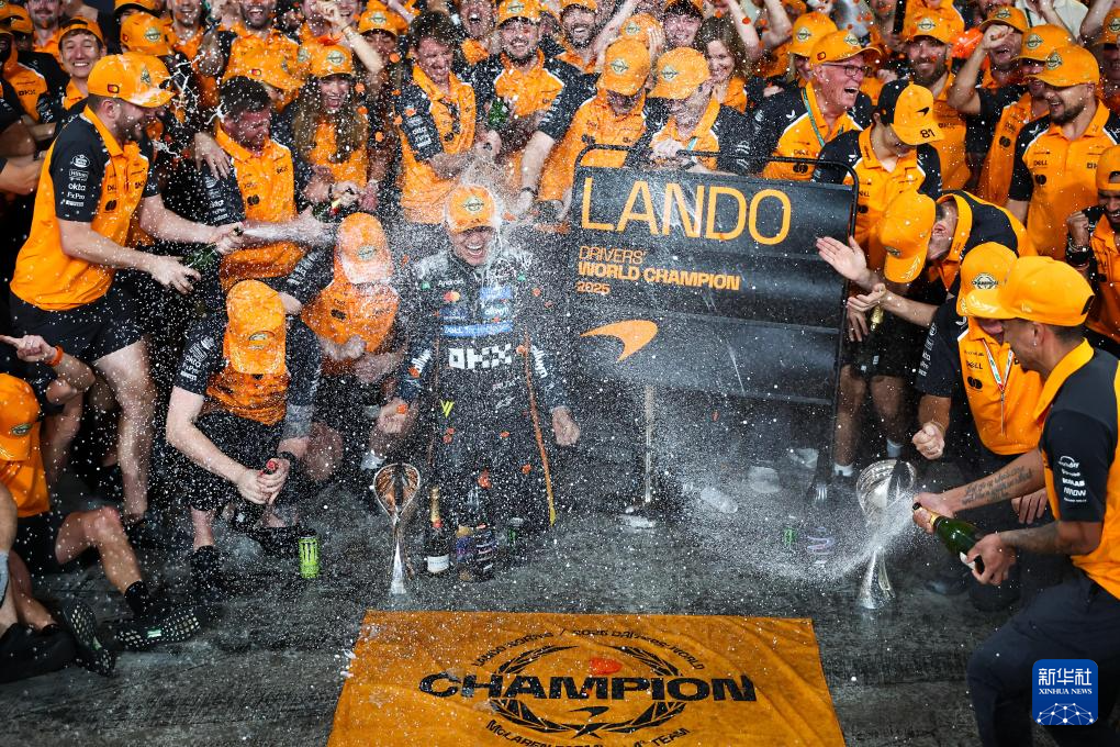 这是12月7日,迈凯伦车队英国车手诺里斯与团队在2025赛季世界一级方程式赛车锦标赛(F1)收官站阿布扎比大奖赛后喷洒香槟庆祝。新华社发