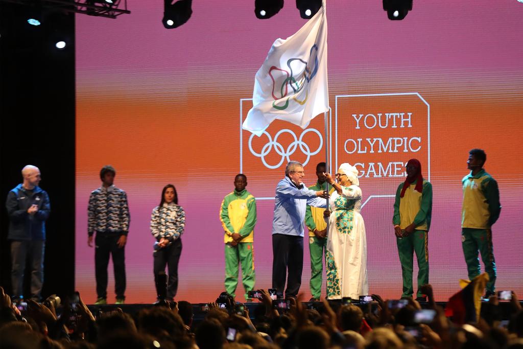 2018年10月18日,时任国际奥委会主席巴赫(左五)在第三届夏季青奥会闭幕式上将奥林匹克会旗交给下届青奥会举办城市、时任达喀尔市长瓦迪尼(右三)。新华社记者 李明 摄