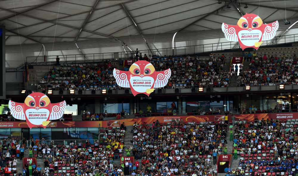 这是2015年北京田径世锦赛吉祥物“燕儿”出现在开幕式上。新华社记者 李钢 摄