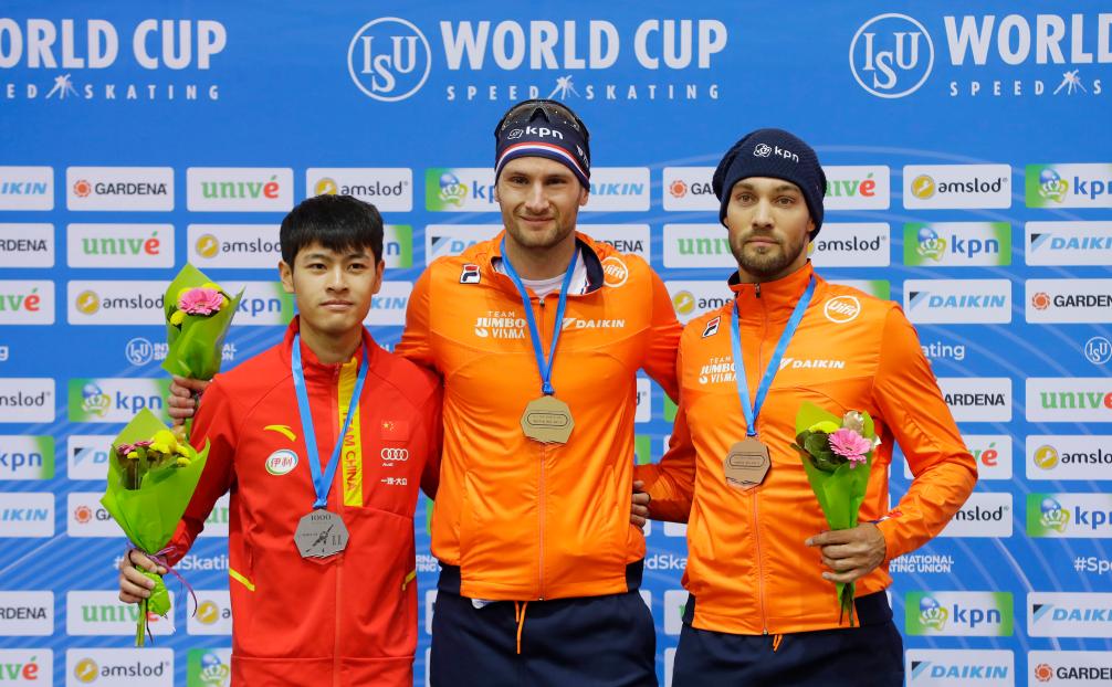 2019年11月16日,亚军中国选手宁忠岩、冠军荷兰选手克罗尔、季军努伊斯(从左至右)在国际滑联速度滑冰世界杯明斯克站男子1000米颁奖仪式上合影。
