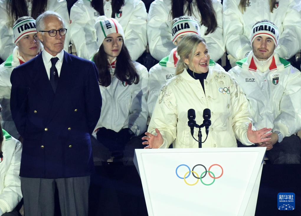 2月22日,米兰-科尔蒂纳冬奥会组委会主席乔瓦尼·马拉戈(前左)在闭幕式上发言。