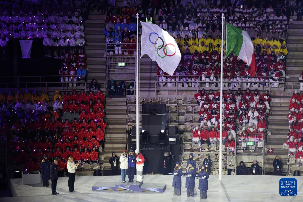 2月22日在闭幕式现场拍摄的奥林匹克会旗和意大利国旗。