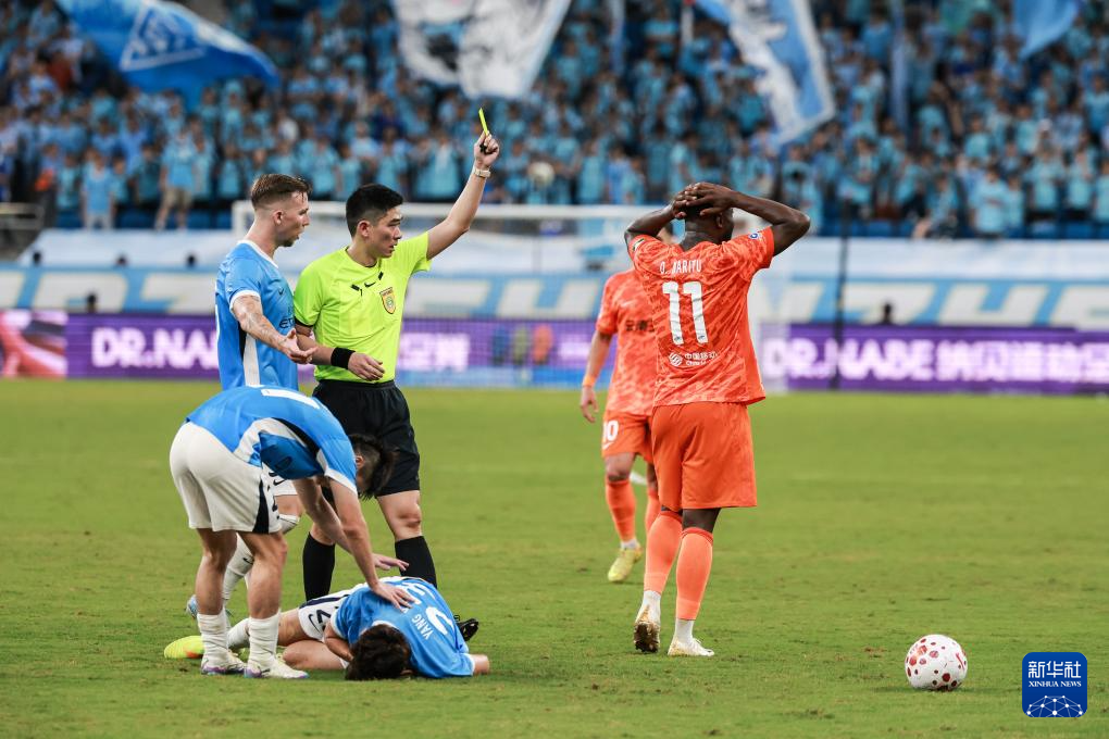 4月12日,主裁判熊星(后左二)在比赛中向云南玉昆队球员奥斯卡(右一)出示黄牌。