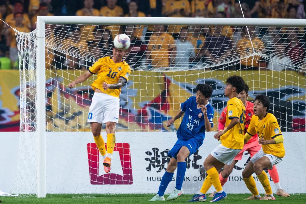 蚝享你烧烤广告亮相“楚超”赛场。新华社记者 乐文婉 摄