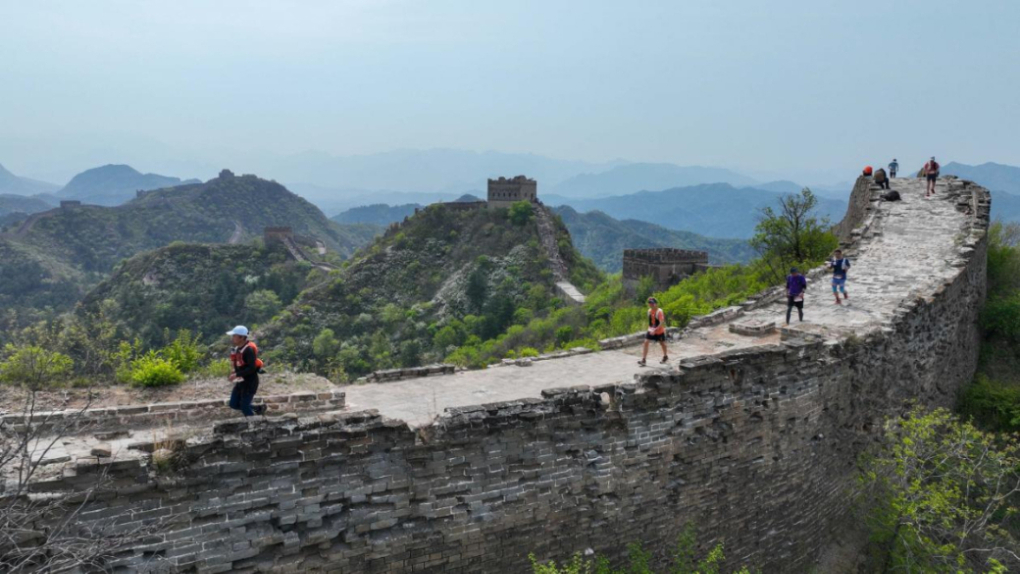 2025年4月26日,参赛选手在比赛中(无人机照片)。当日,2025金山岭长城越野赛黄金联赛世界系列赛(中国站)在河北省承德市滦平县金山岭长城景区开赛。新华社发(王立群摄)