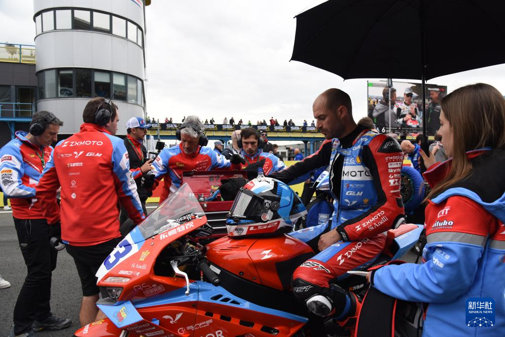 4月18日,“张雪机车”车队法国车手瓦伦丁·德比斯进行赛前准备。